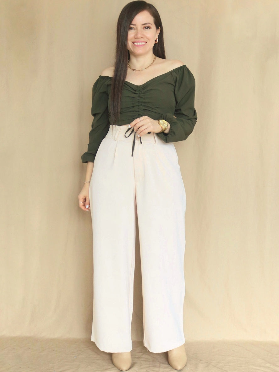 Blusa diseñada con doble pieza en delantero y espalda multiaguja para mejor entalle. Viene con unas cintas reguladoras para poder colocarlo a la altura que desees, logrando formar el escote corazón. Además, lleva mangas largas con elástico para que puedas usarlas también en estilo off shoulder.