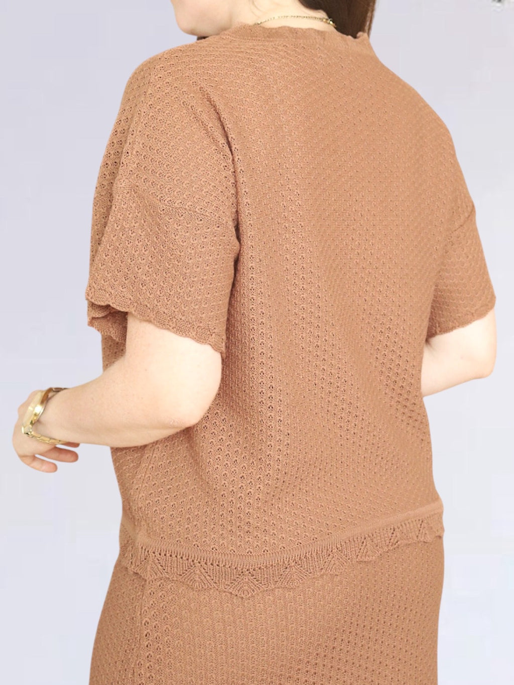 Polo y falda con tejido calado, en hilo tacto algodón con regulador en cintura para poder colocarlo a la altura que desees. Puedes combinarla con la Maxifalda tejida cocos o cualquier falda, short o pantalón.