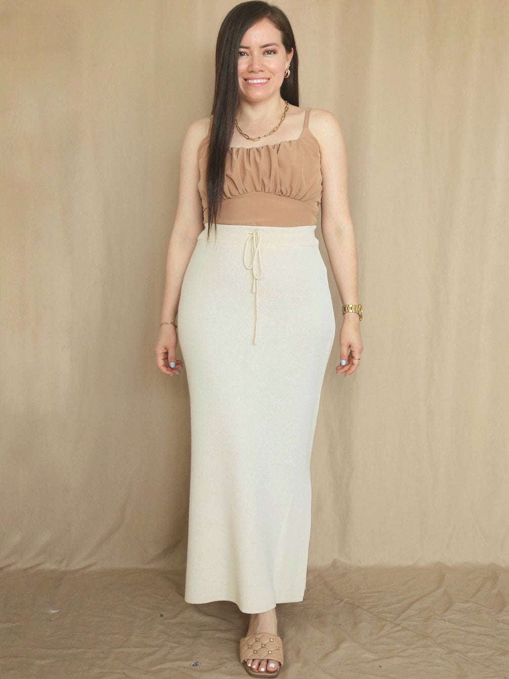 Maxifalda con tejido Jackard, con remalle doble puntada, en hilo tacto algodón con aberturas a cada lado. Puedes usarla con sandalias planas o de taco, botas, botines, stilettos, mules y zapatillas.