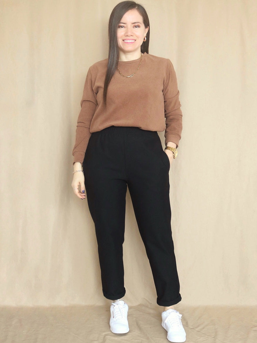 Pantalón a la cintura, de corte slouchy, ligeramente ancho en caderas y con terminación más angosta en piernas, con bolsillos laterales y además bolsillos decorativos en la parte posterior. Con entalle en la cintura gracias a la pretina elasticada en toda la cintura.
