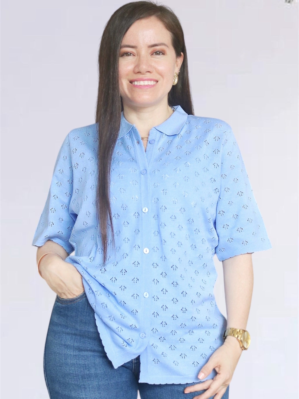 Cardigan tejido en hilo tacto algodón con tejido punto Jersey con calados, con detalle de cuello camisero y botones y ojales funcionales para poder utilizarlo abierto o cerrado, que será tu complemento perfecto encima de cualquier polo o top o cerrado totalmente. Abarca desde la talla S hasta la talla L.