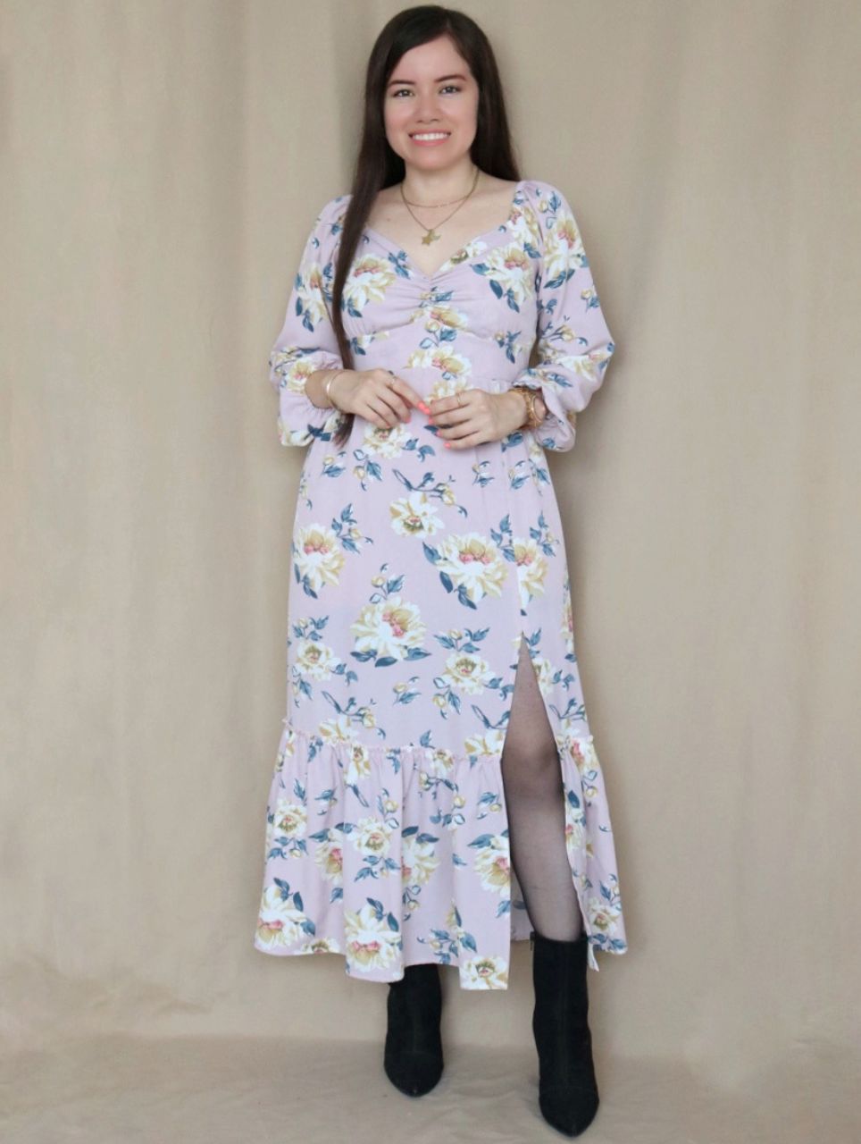 Vestido diseñado en corte A, con pretina plana en delantero y elástico en cintura posterior; con escote corazón en busto y espalda con lazos para amarrar. Viene con faldón en 2 tiempos, con un sutil recogido en el segundo faldón y abertura en pierna, con forro interno separado en falda, de estilo fustán que podrás usarlo en diferentes vestidos. Además cuenta con mangas largas con elástico en los hombros de estilo off shoulder, abullonadas y ceñidas con elástico delgado en la parte final, que lo hace muy romántico y femenino. Puedes usarlo con sandalias de taco o planas, stilettos, botas, botines y hasta zapatillas, dependiendo de la ocasión.
