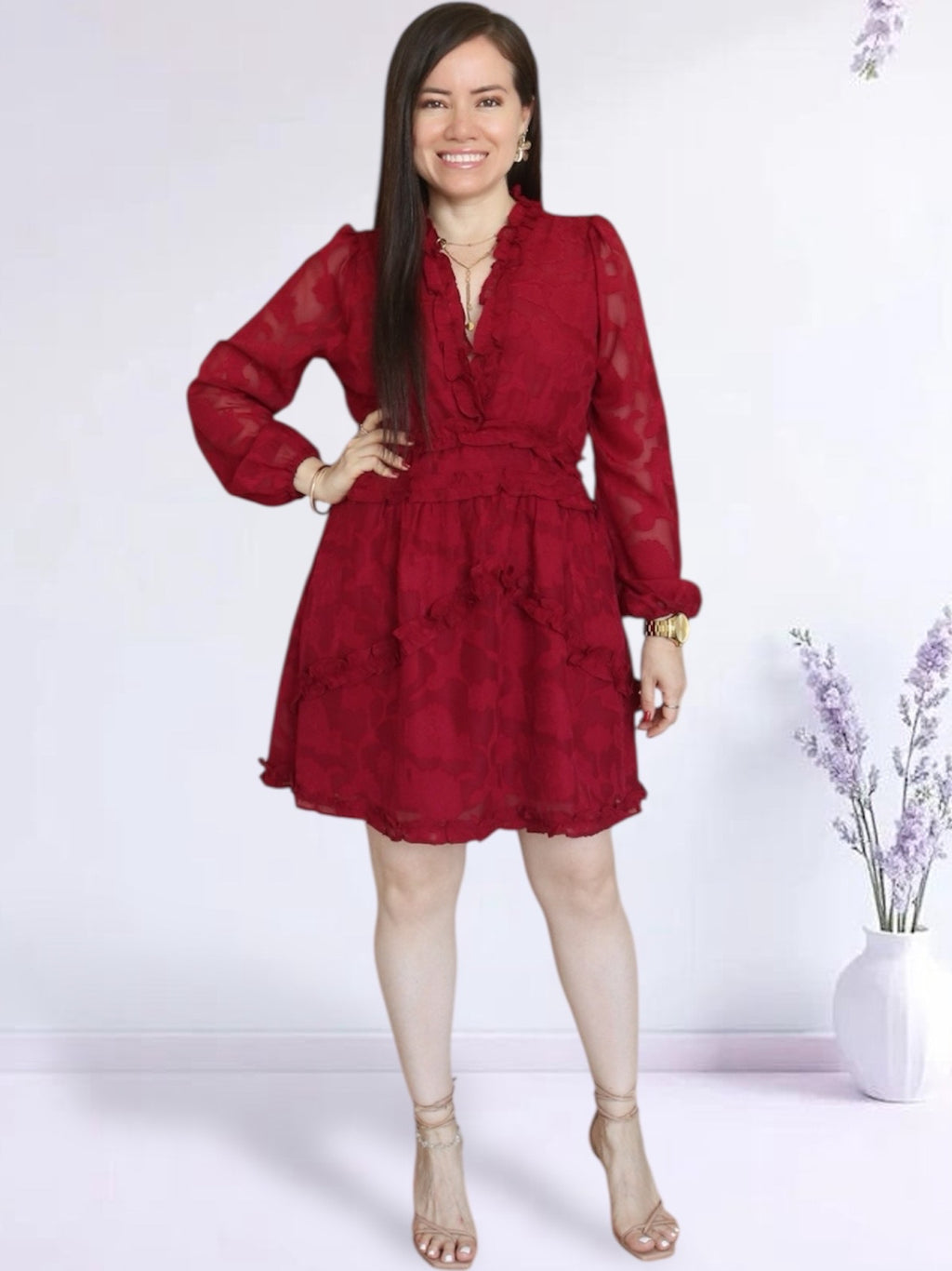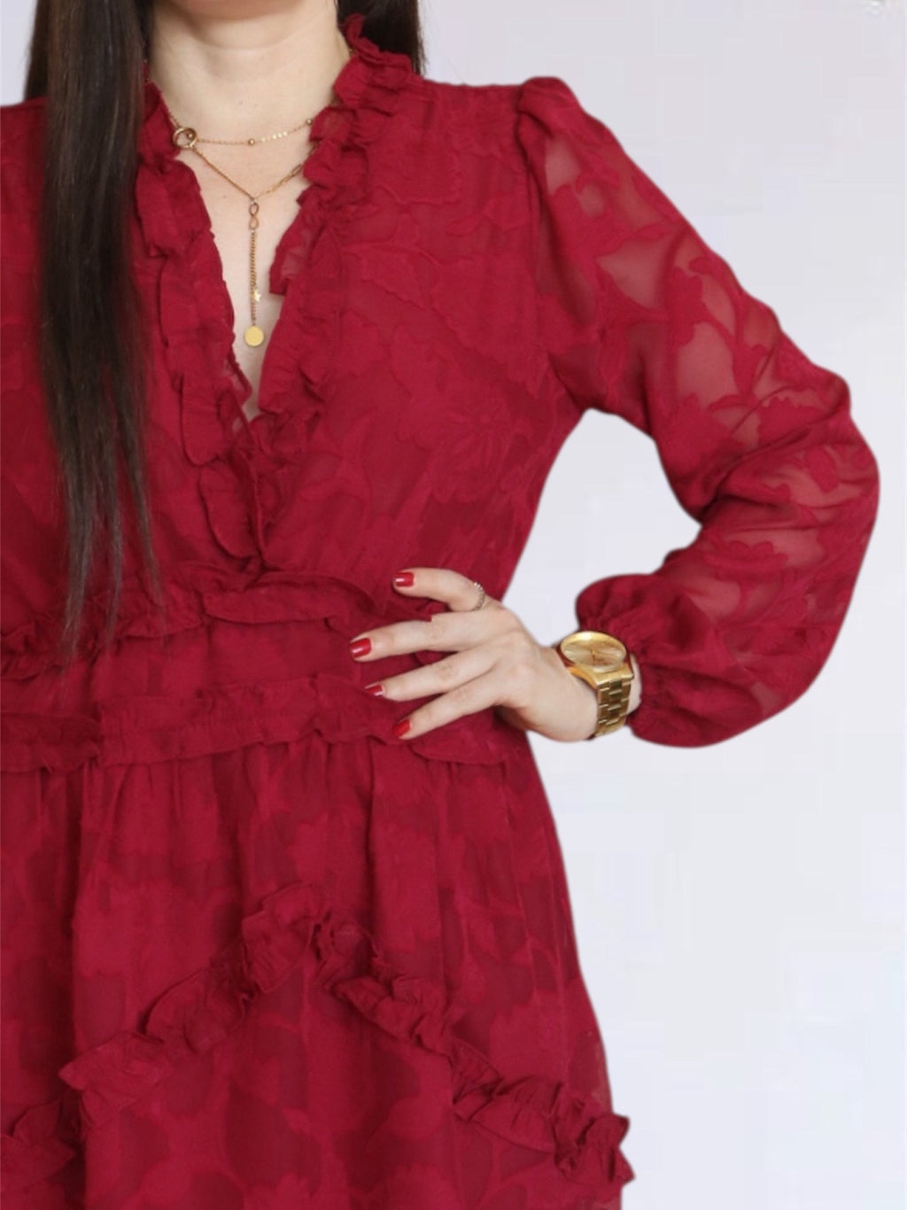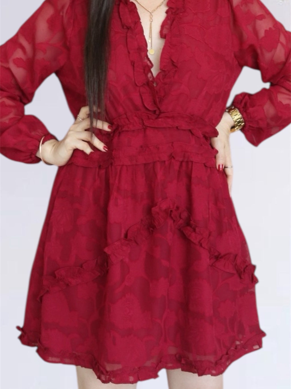 VESTIDO CORTO FULL BOBOS CON PRETINA GUINDA