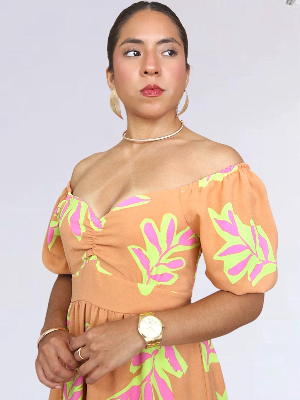MAXIVESTIDO ESCOTE CORAZÓN ESTAMPADO NARANJA