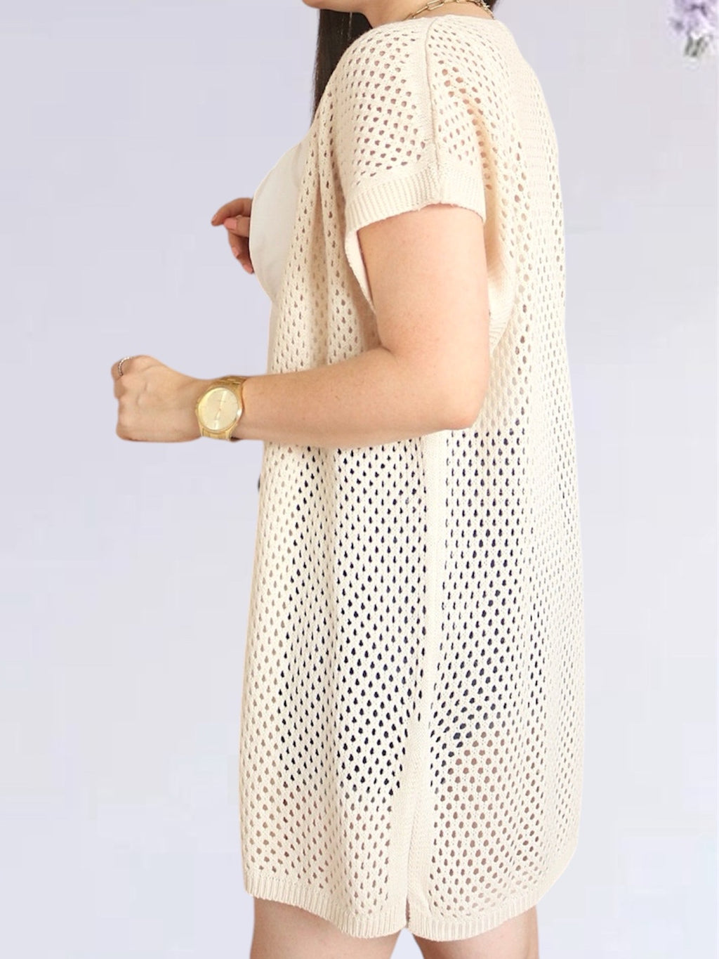 Cardigan tejido en hilo tacto algodón, con detalle de manga cero para poder utilizarlo como complemento perfecto encima de cualquier polo, top o ropa de baño. Abarca desde la talla S hasta la talla L.