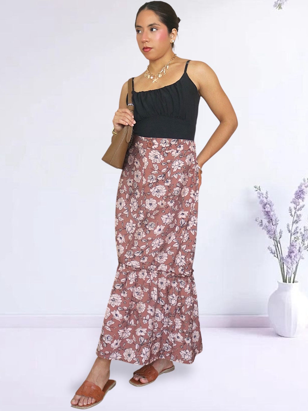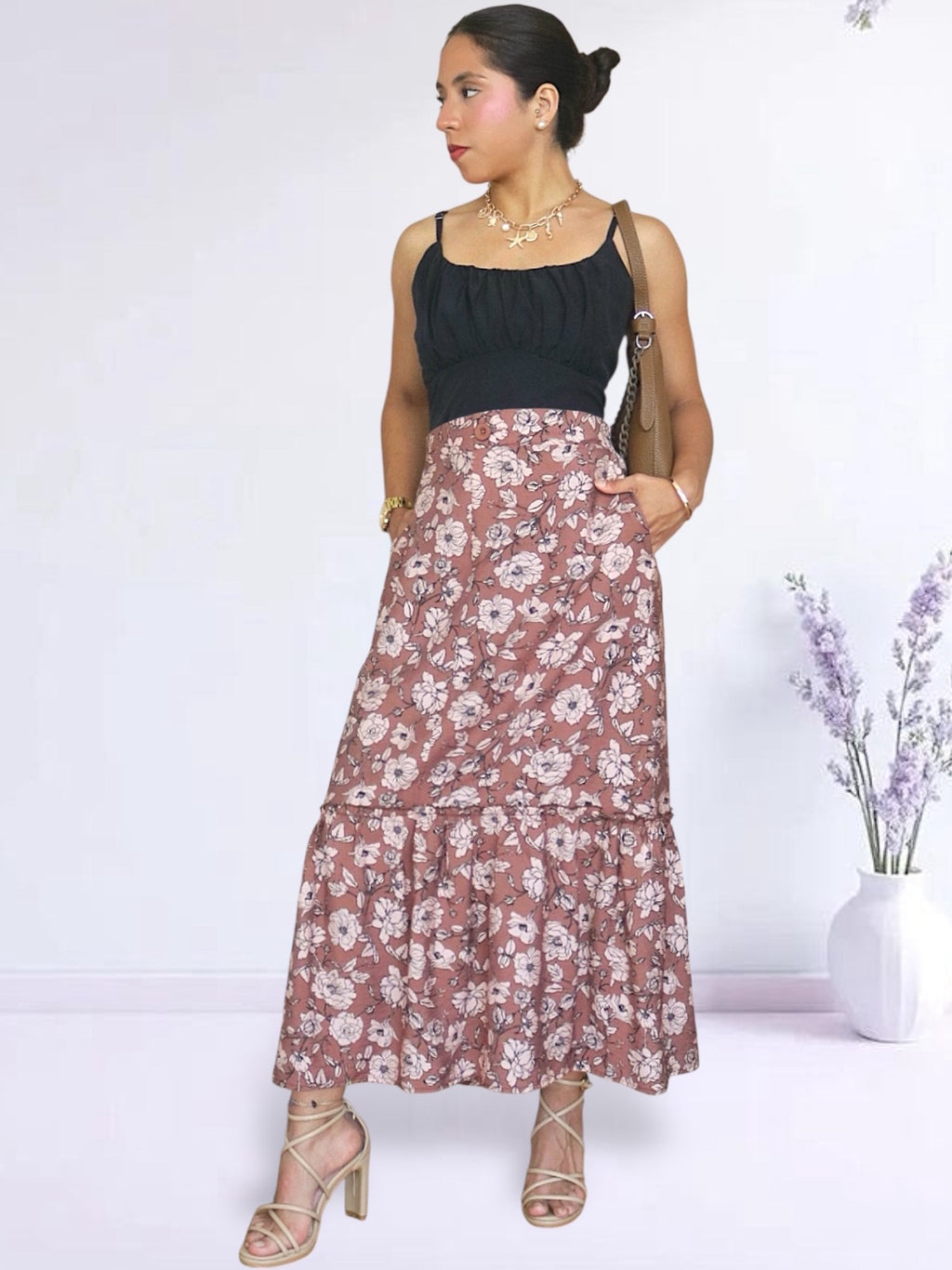 Falda confeccionada en corte A con el detalle de recogido en la parte inferior. Viene con botón y ojal y bolsillos laterales. Cuenta con pretina delgada y plana en la parte delantera y pretina con elástico en la parte posterior. Puedes usarla con sandalias planas o de taco, botas, botines, stilettos, mules y zapatillas.
