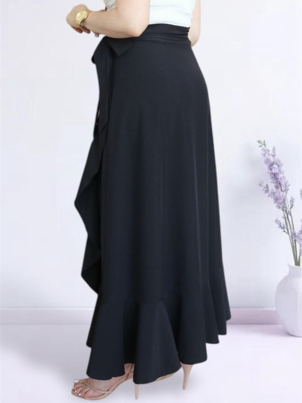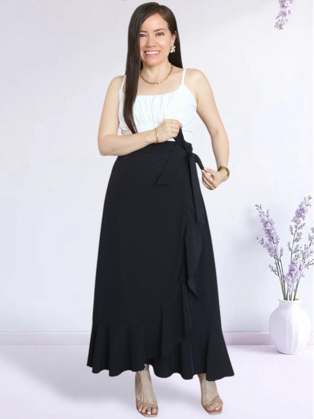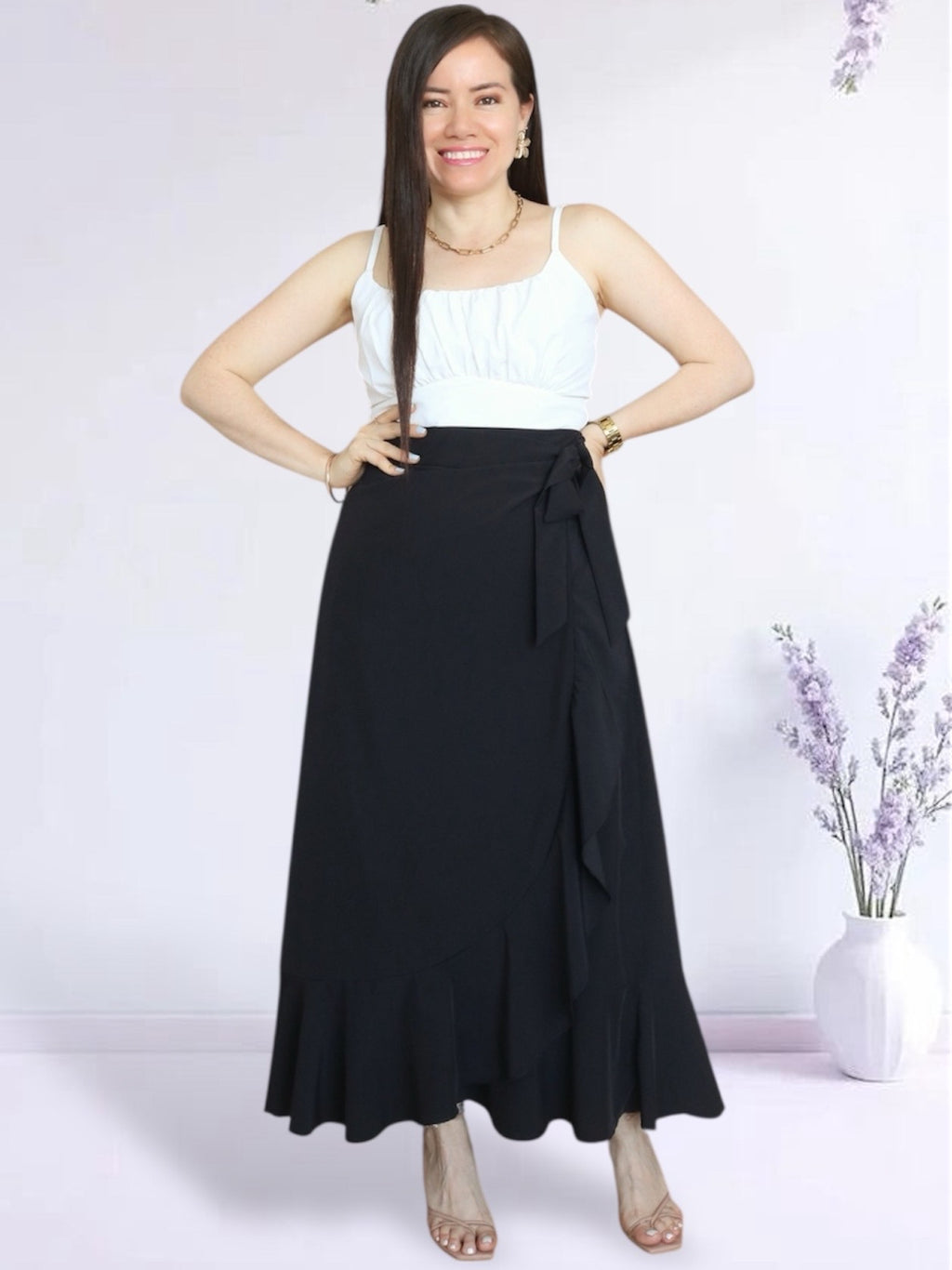 Falda confeccionada en ligero corte A, con función envolvente una pieza sobre otra y detalle de vuelos en basta que le da una fluidez elegante a la misma. Cuenta con ojal en una pretina por donde pasarás la cinta, que llevarás por detrás para finalmente hacer un lazo al costado. Puedes usarla con sandalias planas o de taco, botas, botines, stilettos y hasta zapatillas.