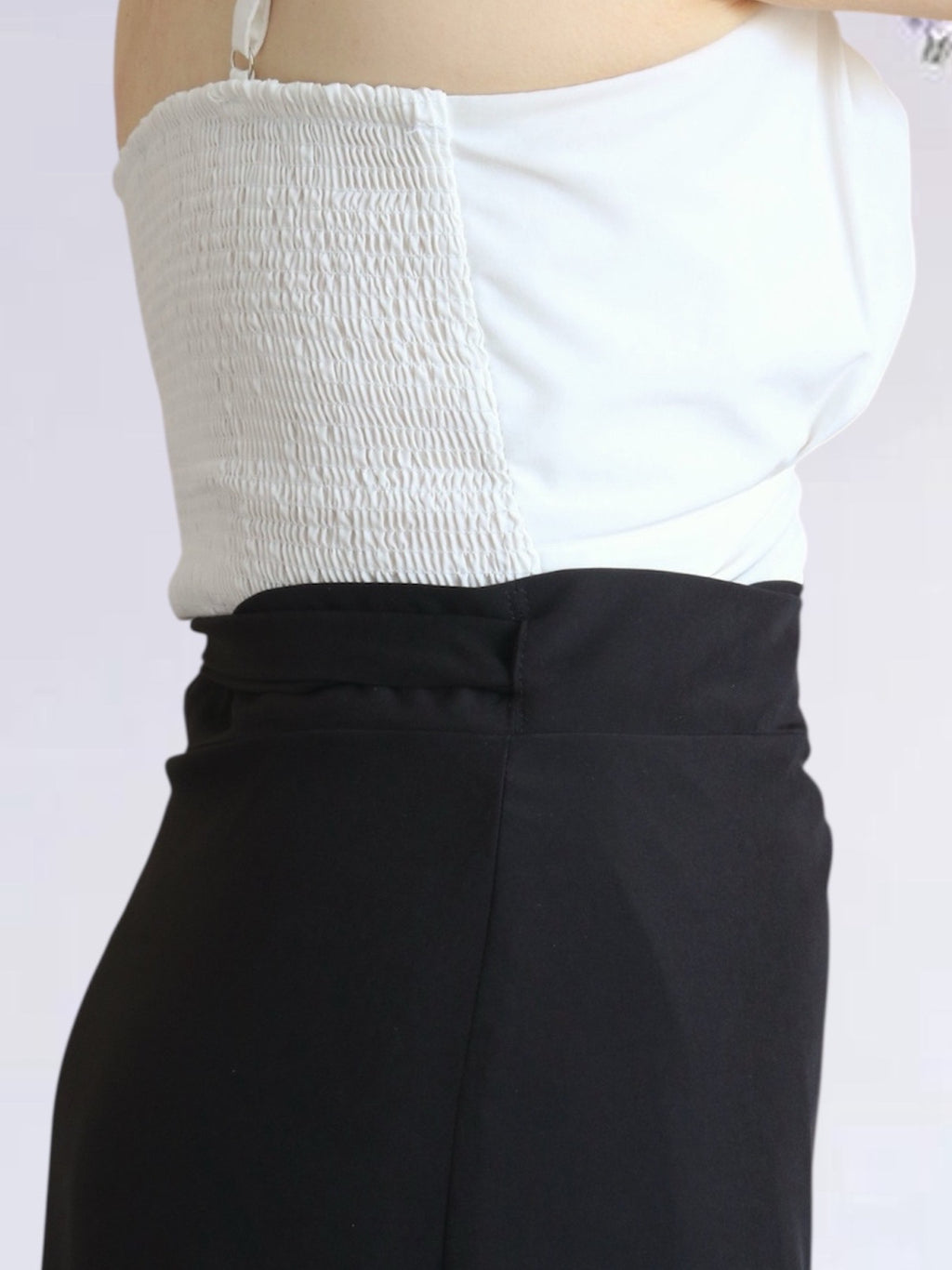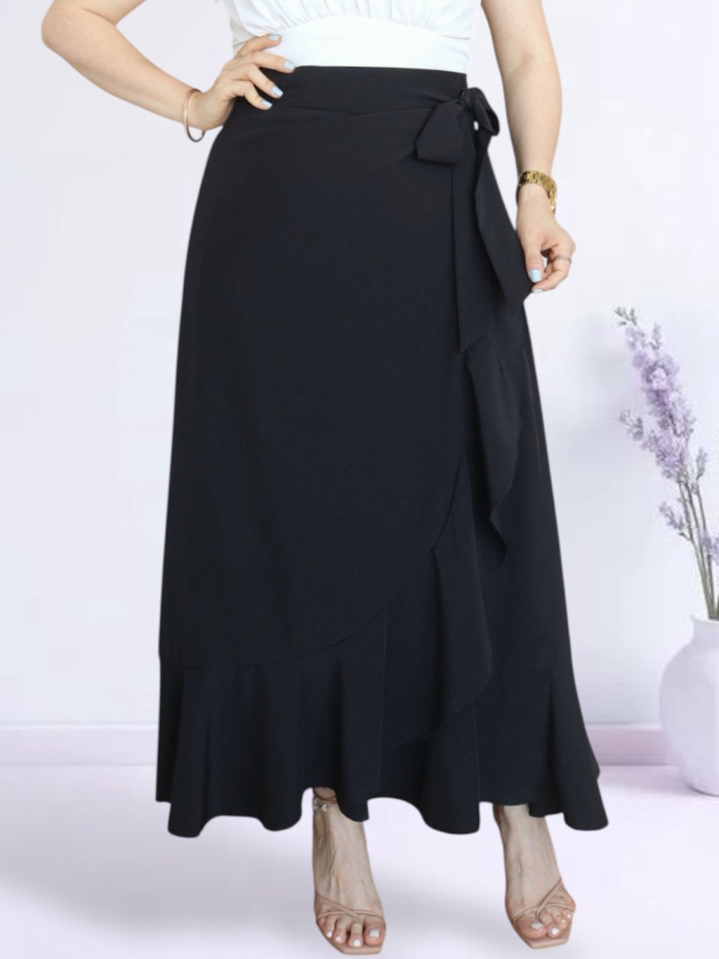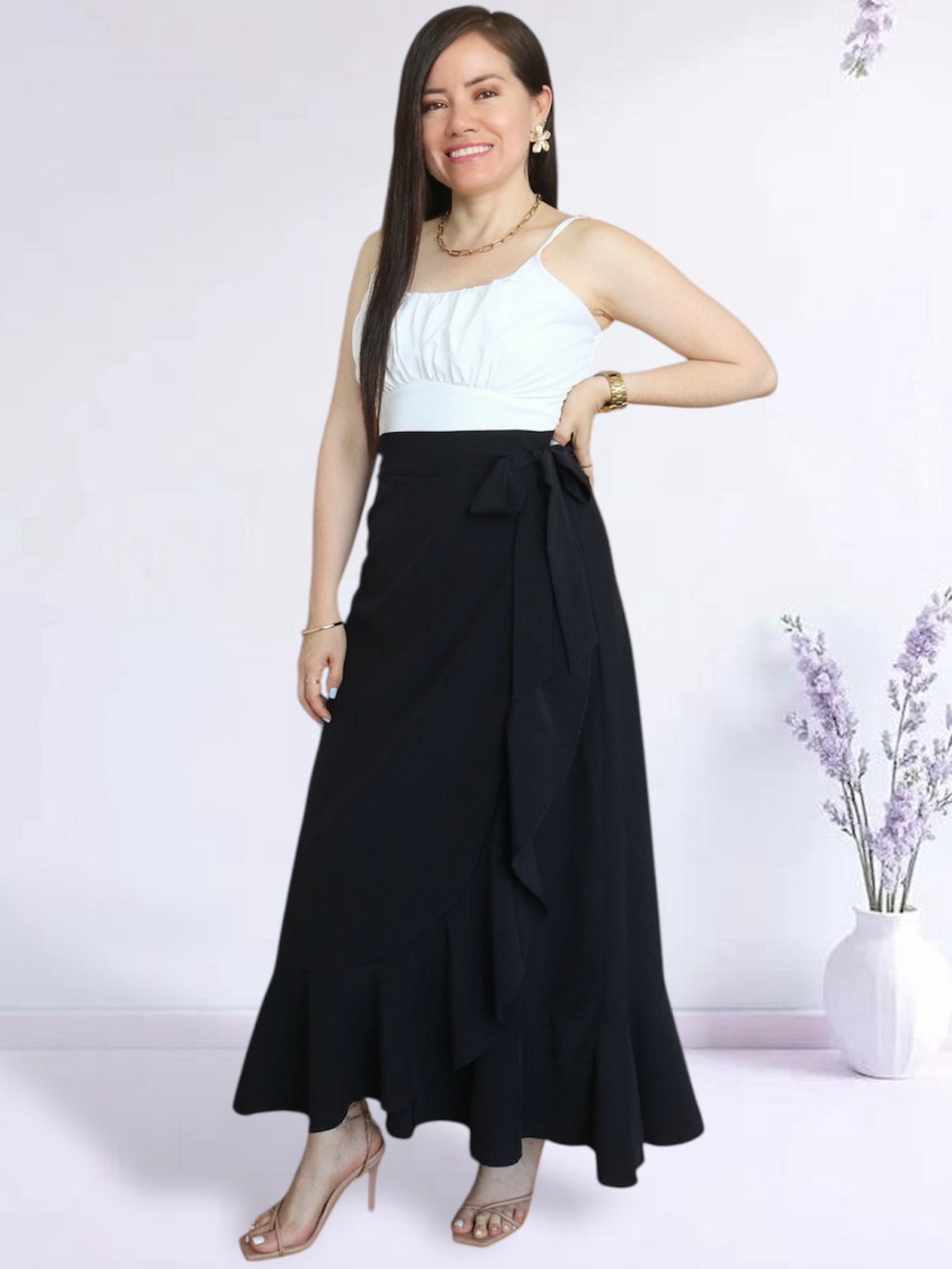 Falda confeccionada en ligero corte A, con función envolvente una pieza sobre otra y detalle de vuelos en basta que le da una fluidez elegante a la misma. Cuenta con ojal en una pretina por donde pasarás la cinta, que llevarás por detrás para finalmente hacer un lazo al costado. Puedes usarla con sandalias planas o de taco, botas, botines, stilettos y hasta zapatillas.