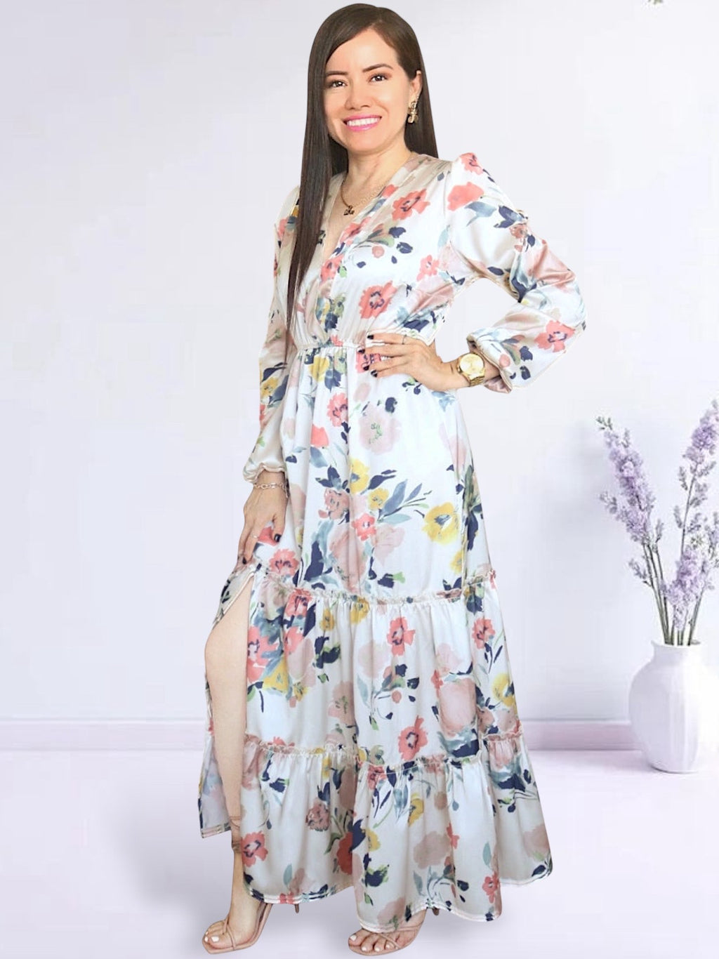 Vestido diseñado en corte A, ceñido en cintura gracias al elástico incorporado; con cuello pico cruzado y faldón en 3 tiempos, con forro mini en falda, con sutiles recogidos en cada faldón y abertura en pierna. Acompañado por unas mangas largas con recogido en los hombros, ligeramente abullonadas y ceñidas con elástico delgado en la parte final, que lo hace muy romántico y femenino. Puedes usarlo con sandalias planas o de taco, stilettos, botas, botines y hasta zapatillas, dependiendo de la ocasión.