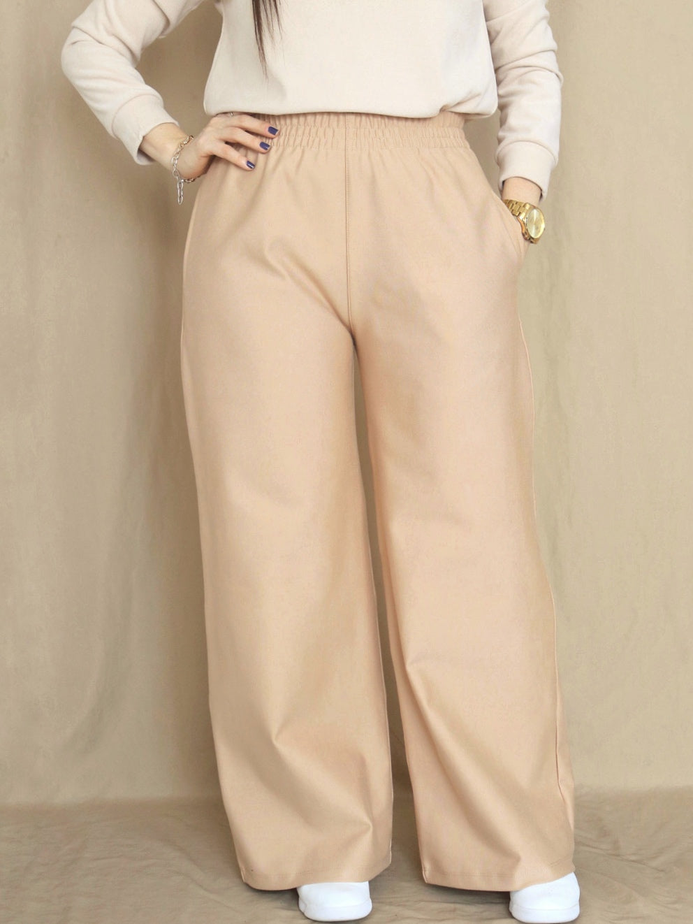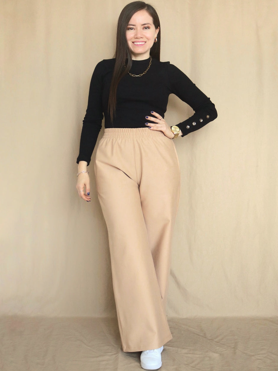Pantalón a la cintura, de estilo palazo con amplitud en cadera y pierna ancha, bolsillos laterales y además tapas decorativas en la parte posterior. Con entalle en la cintura gracias a la pretina elasticada en toda la cintura.