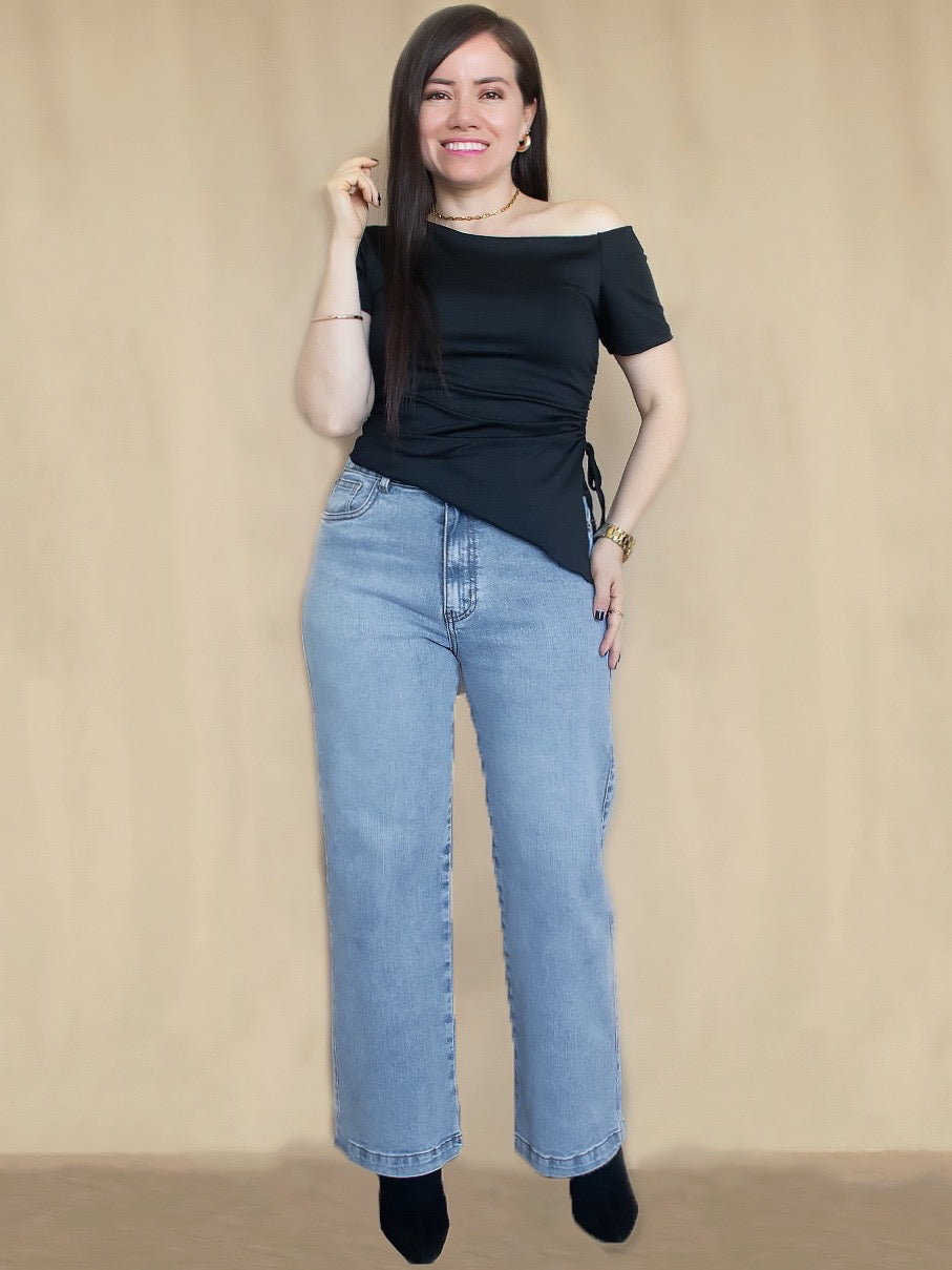 Pantalón elaborado en denim semi estretch. De tiro alto a la cintura, además de cierre y bolsillos reales delanteros y posteriores. En tamaño Petit.