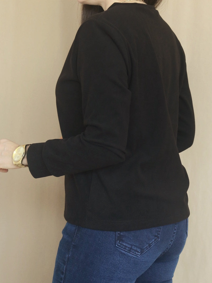 Polo de estilo básico confeccionado en tela de polar ligero, con cuello redondo, manga clásica y puño.