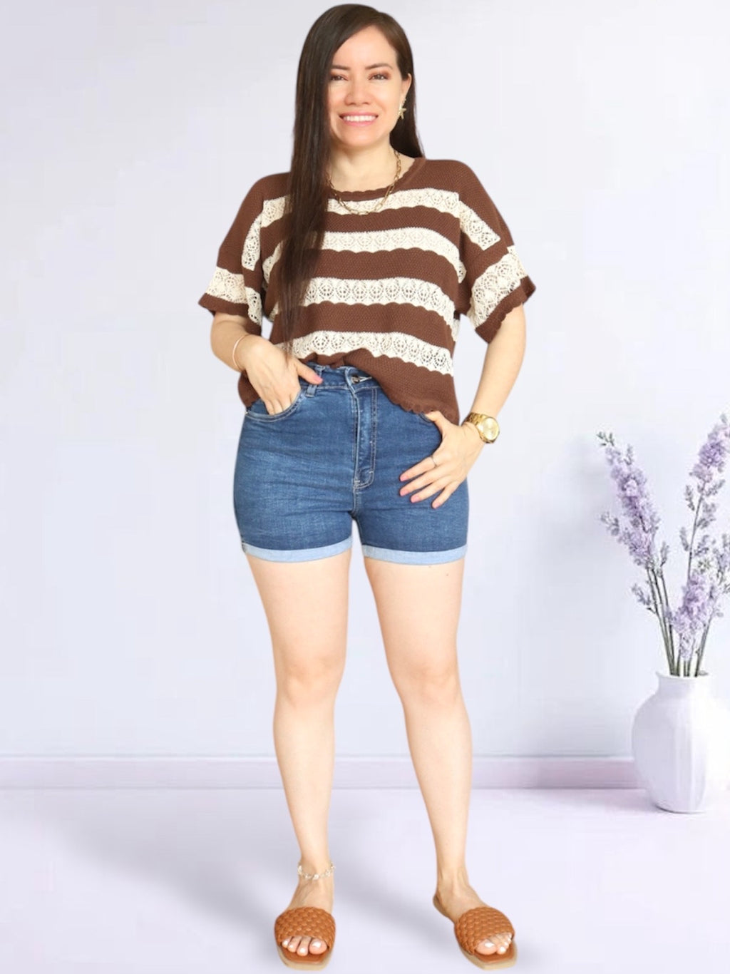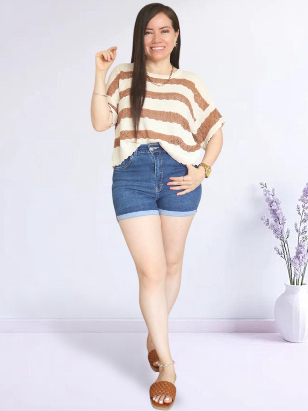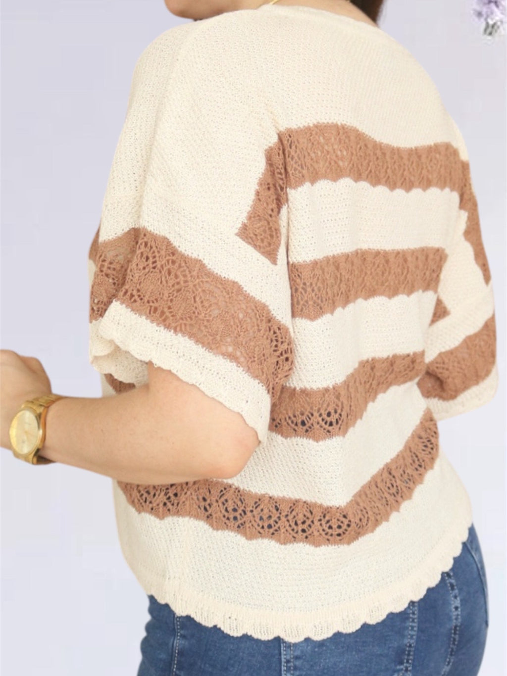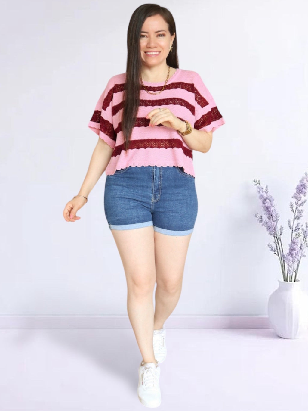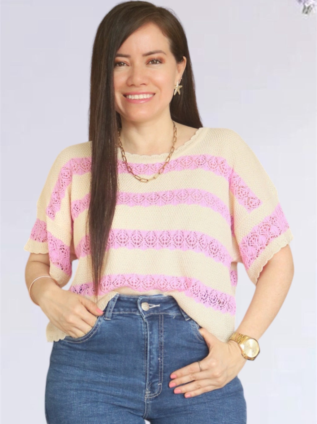 Polo tejido en hilo tacto algodón con detalle de franjas y terminado de olas en cuello, manga y basta. Puedes combinarla con cualquier falda, short o pantalón.